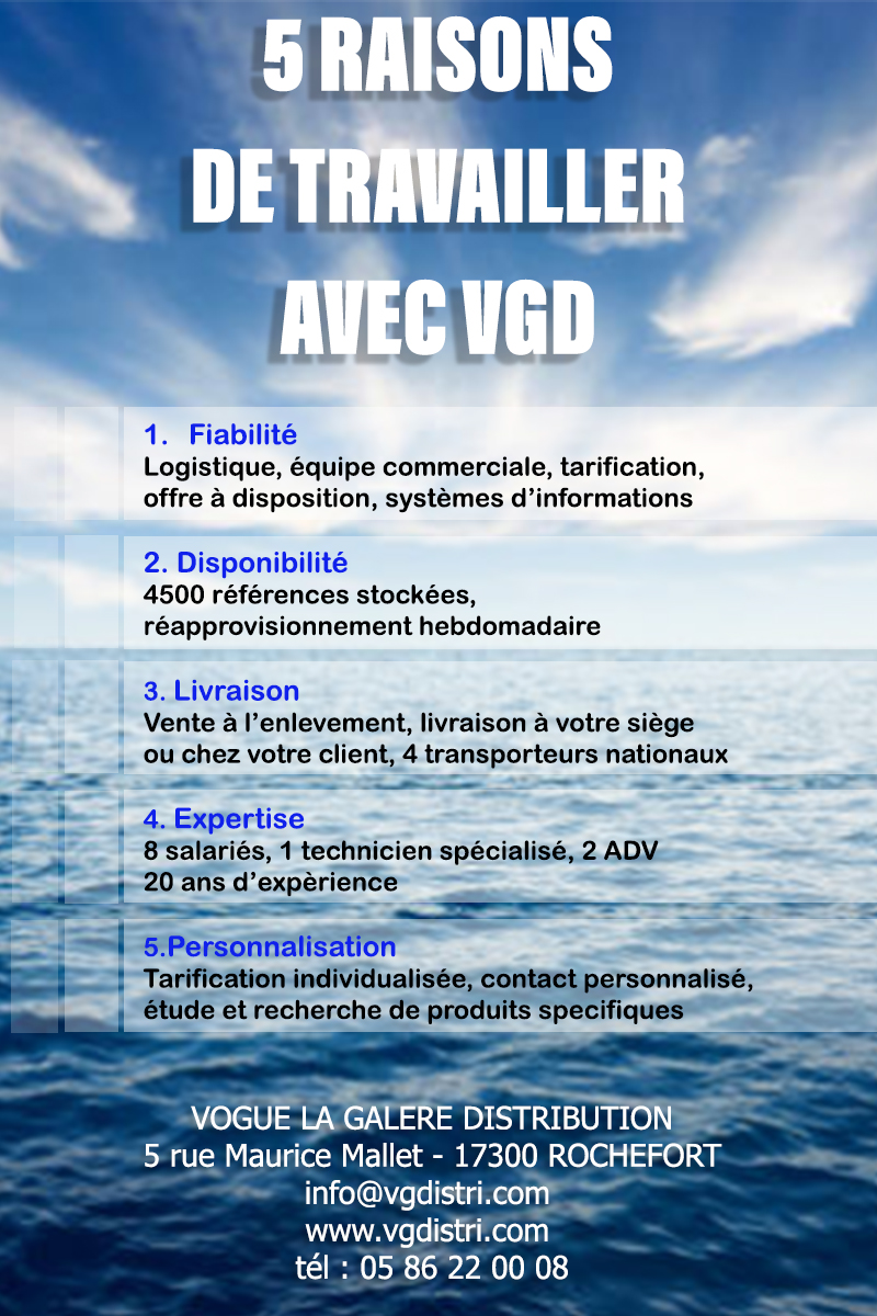 Vogue la Galère Distribution (VGD) est distributeur d’équipement nautique auprès des professionnels depuis 1998.